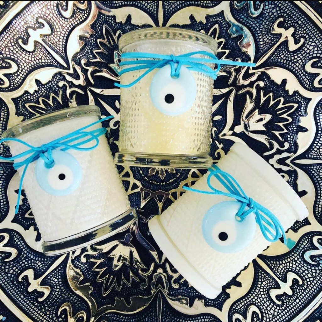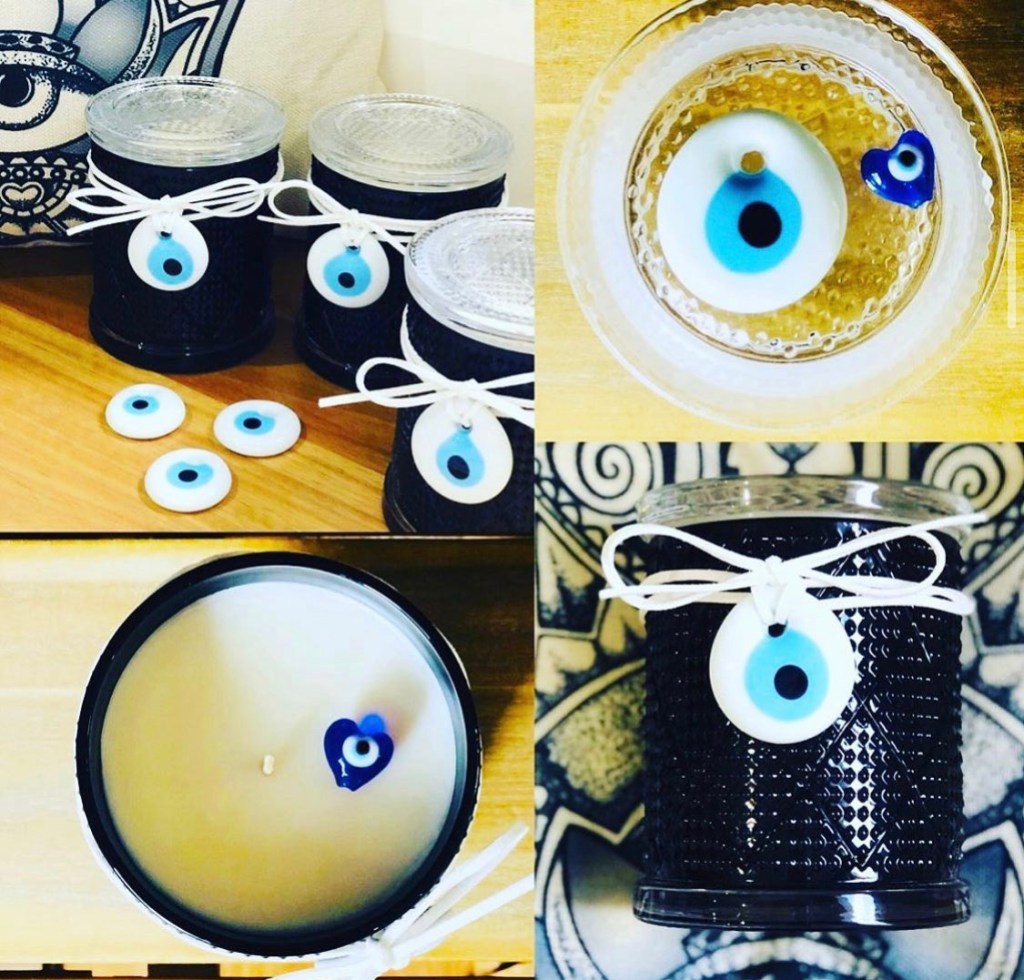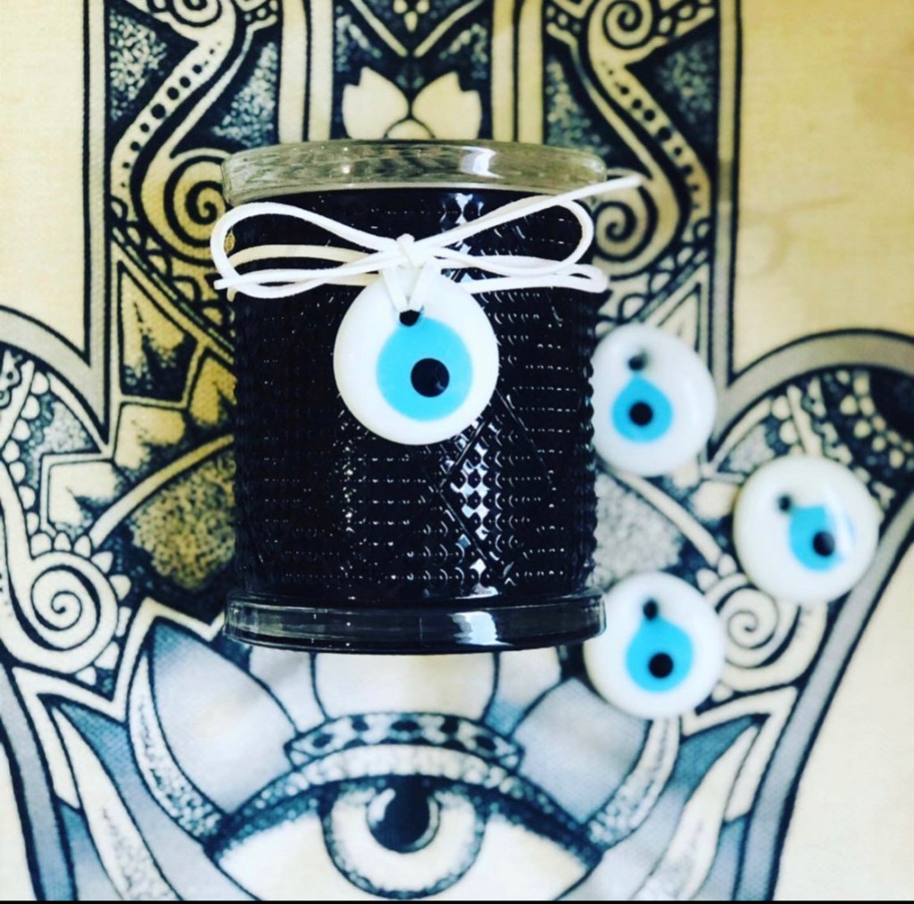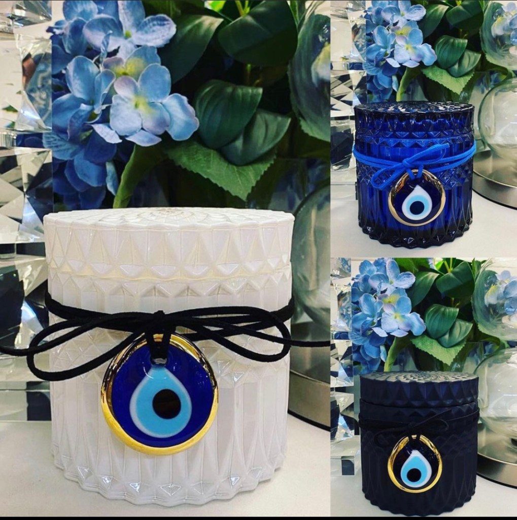 MATI – The Eye Candle ™️ in LUXE Edition Jar & White or Turquoise Glass MATI amulet. These beautiful Gloss Black / White or Clear Rough Diamond Cut patterned jar paired with a unique White or Turquoise MATI glass talisman on leather wrap! Black Jar in much loved Ouzo Menta scent White or Clear jars in Livani scent.