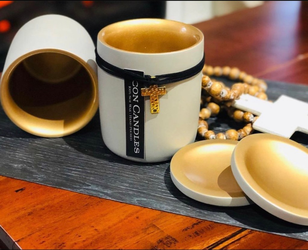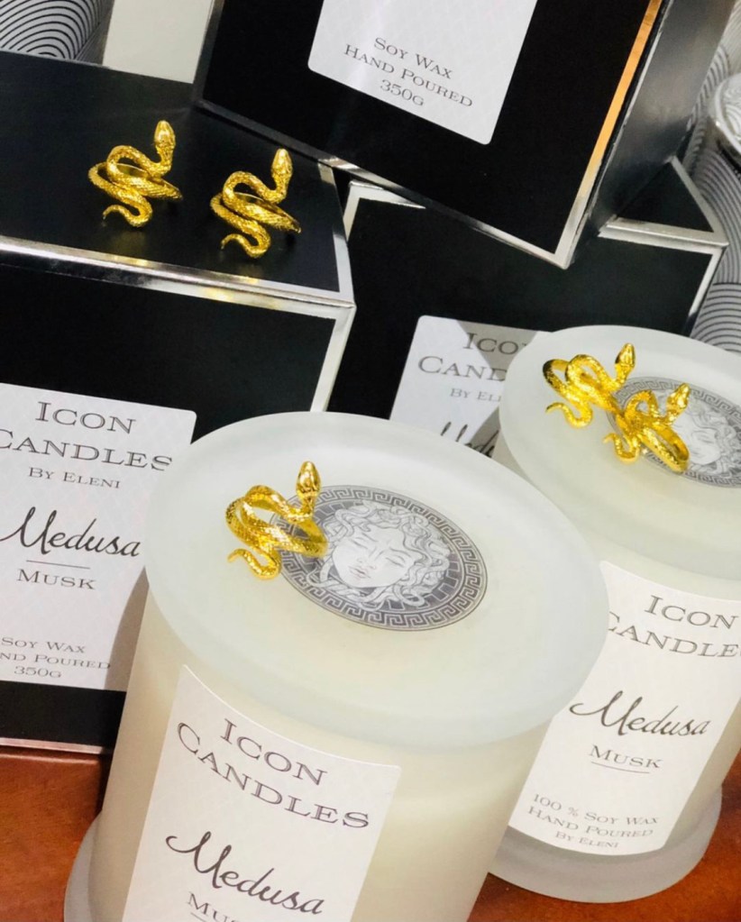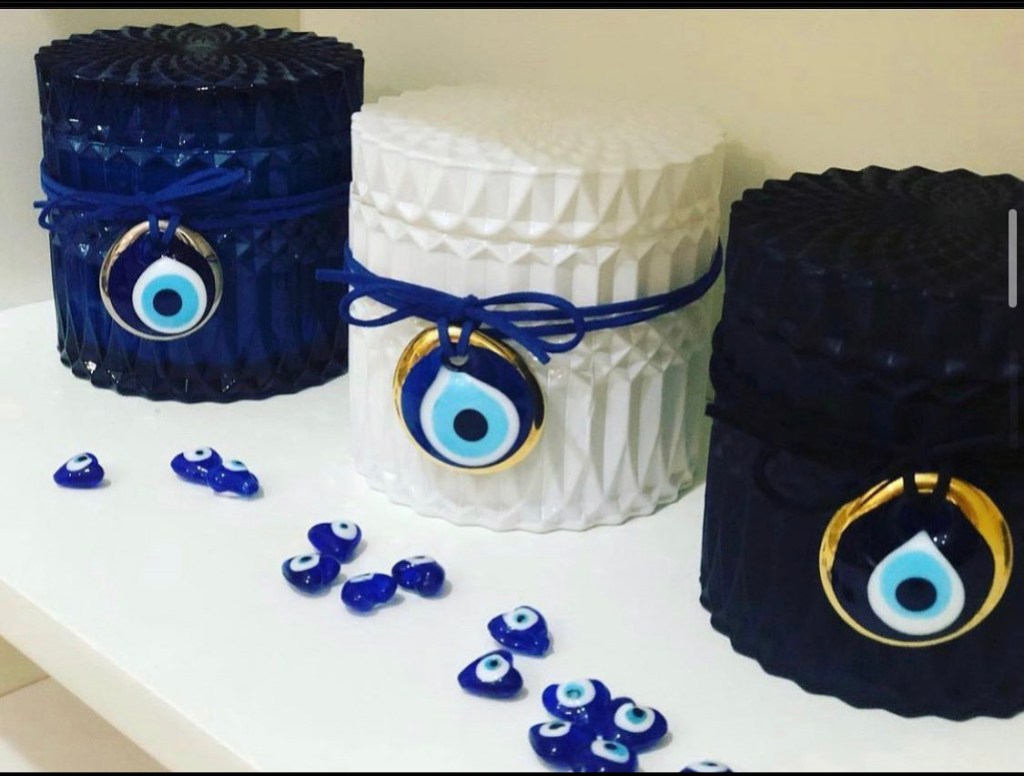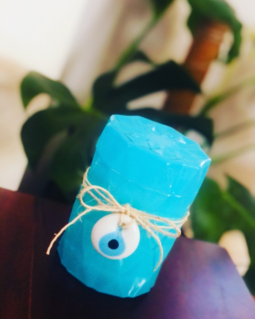 MATI – The Eye Candle ™️ in LUXE Edition Jar & White or Turquoise Glass MATI amulet. These beautiful Gloss Black / White or Clear Rough Diamond Cut patterned jar paired with a unique White or Turquoise MATI glass talisman on leather wrap! Black Jar in much loved Ouzo Menta scent White or Clear jars in Livani scent.